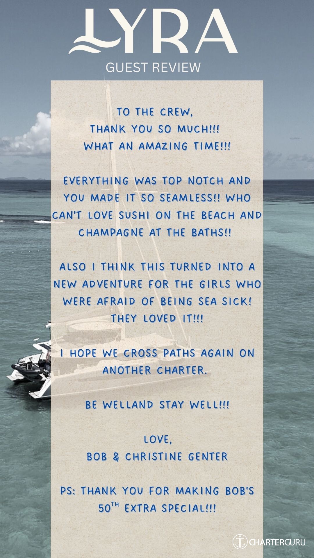 We adore the Lyra crew and we recommend her to everyone!